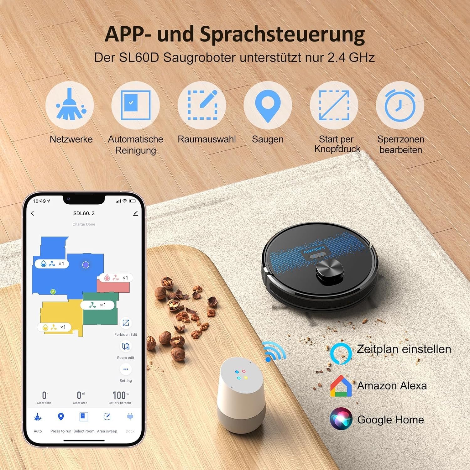 Hinweis: Der Staubsauger Roboter muss an ein 2,4-GHz-Netzwerk angeschlossen sein, um normal verwendet werden zu können!