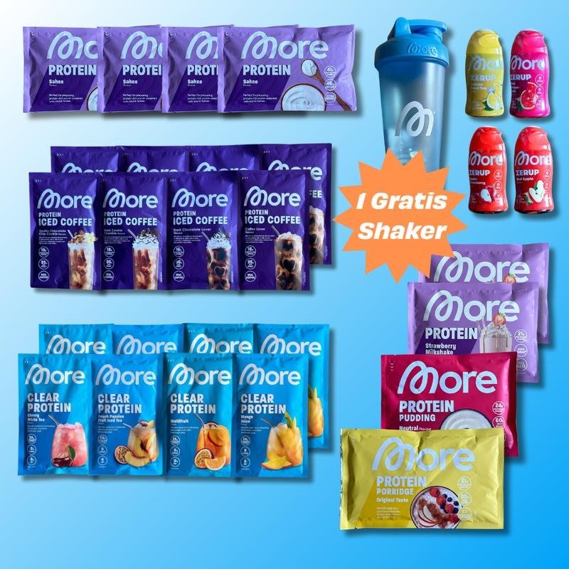 XXL Protein Box – MORE Nutrition – (Zerup, Clear Whey, Protein Iced Coffee, Protein Milkshake, Protein Sahne, Protein Grießpudding, Protein Pudding, Shaker)